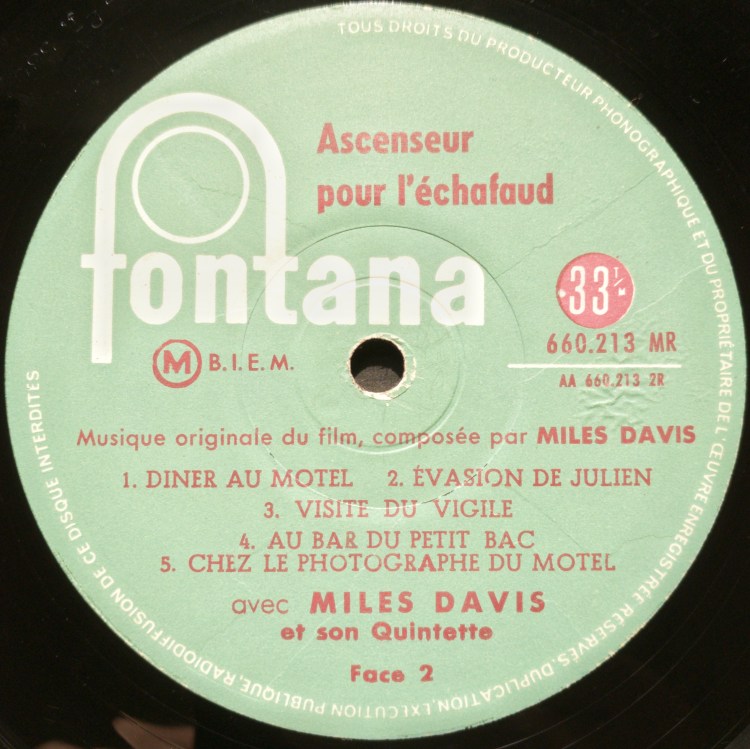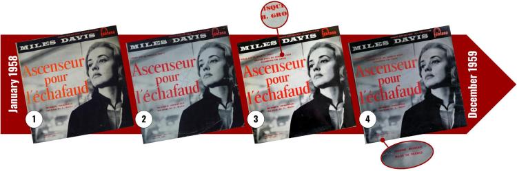 There is one tiny detail that makes this aspect of original copies of Ascenseur Pour L’échafaud much more complicated yet provides a powerful forensic tool. There are a variety of different numbers after the printer’s credit that can be used to identify when the cover was printed and thus accurately determine the age of individual copies. This number always comprises two or three digits. The first one or two digits identify the month and the last digit identifies the year. So, for example 18 represents the first month of the eighth year (i.e. January 1958) and 99 represents the ninth month of the ninth year (i.e. September 1959). The earliest copies I’ve seen were printed in January 1958 but I suppose it is theoretically possible (but unlikely) that some were printed in December 1957 given that the recording sessions only took place early that month. I would be interested to know if anybody has a copy with the number 127 after the printer’s credit. My assumption is that the last possible number that could have been used is 129 (for December 1959) but it is possible that no copies were printed that month. Extrapolating further, I assume that copies without a number were printed after December 1959.