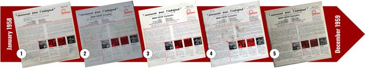 While not strictly speaking an attribute of the front cover, it is worth at this point describing one other obscure detail for collectors. The difference between Variant 2 and Variant 3 suggests that the record was awarded the Acadamie Charles Cros Grand Prix du Disque between the printings of these two variants. Fontana clearly didn’t want to wait until the Variant 3 cover was in the shops to make the most of this marketing opportunity so they went for a cost-effective tactical solution: they created a 1950s French version of the obi that is commonly seen wrapped about Japanese re-issues. This quaintly named “banderole” was made from brown paper/thin card and advertised the award. Copies of the record complete with this are the rarest (but not earliest) version and I have only ever seen a photograph of a copy from just one eBay auction.