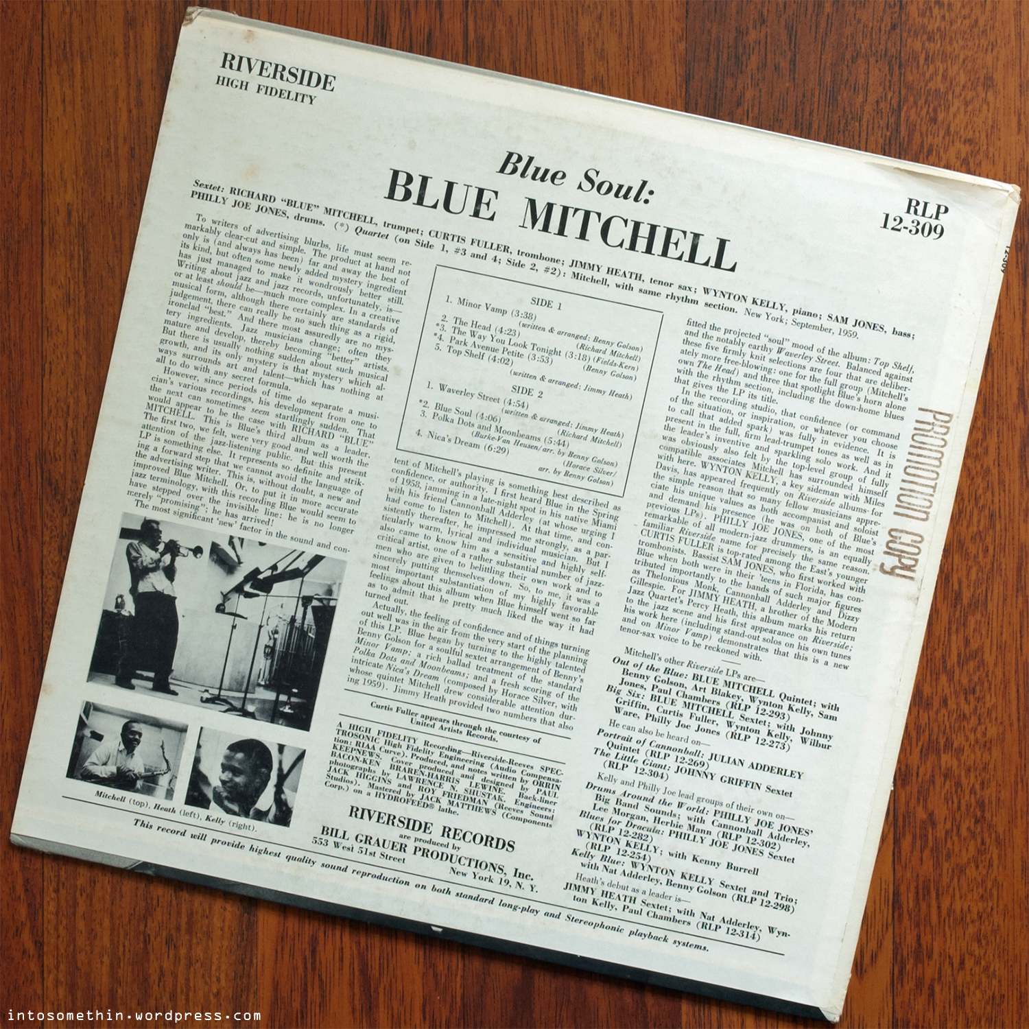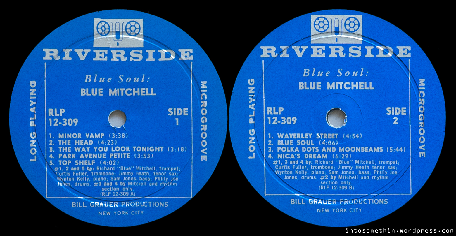 Artist: Blue Mitchell. Title: Blue Soul. Label and Catalogue Number: Riverside RLP 12-309. Personnel: Blue Mitchell (trumpet); Jimmy Heath (tenor sax); Curtis Fuller (trombone); Wynton Kelly (piano); Sam Jones (bass); “Philly” Joe Jones (drums). Side 1: Minor Vamp; The Head; The Way You Look Tonight; Park Avenue Petite; Top Shelf. Side 2: Waverley Street; Blue Soul; Polka Dots and Moonbeams; Nica’s Dream. Recording Date: 24, 28 and 30 September 1959 at Reeves Sound Studios, New York City, New York, USA.