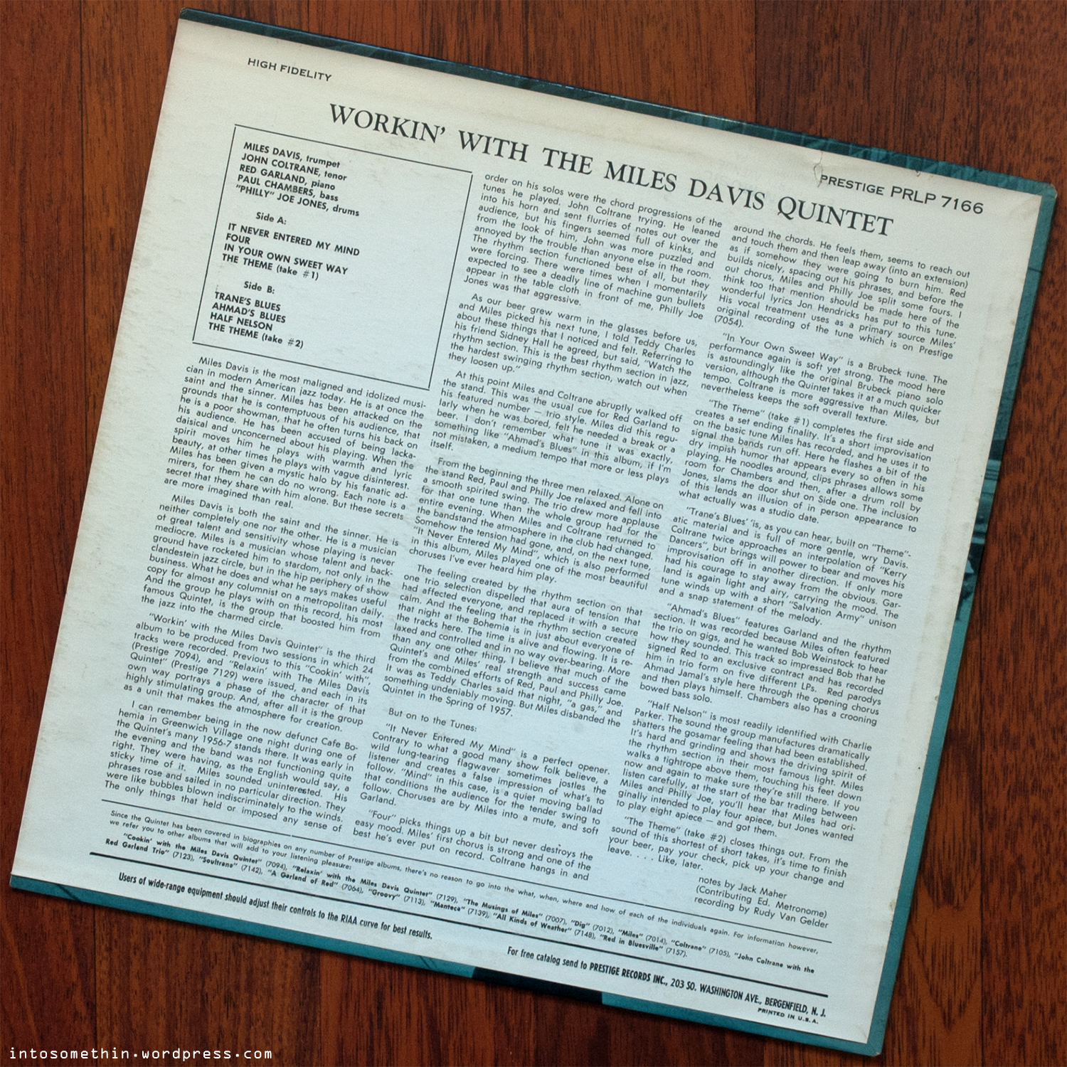 The lucky writer who got the honour to pen the liner notes for this classic was one Jack Maher – not a name I’ve seen credited with many liner notes but identified here with suitable creditials as a Contributing Editor for Metronome magazine. Maher’s challenge was to follow the lead set by the estimable Ira Gitler on the previous two Miles Davis Quintet Prestige releases. It’s a baton he picks up with some gusto…