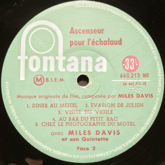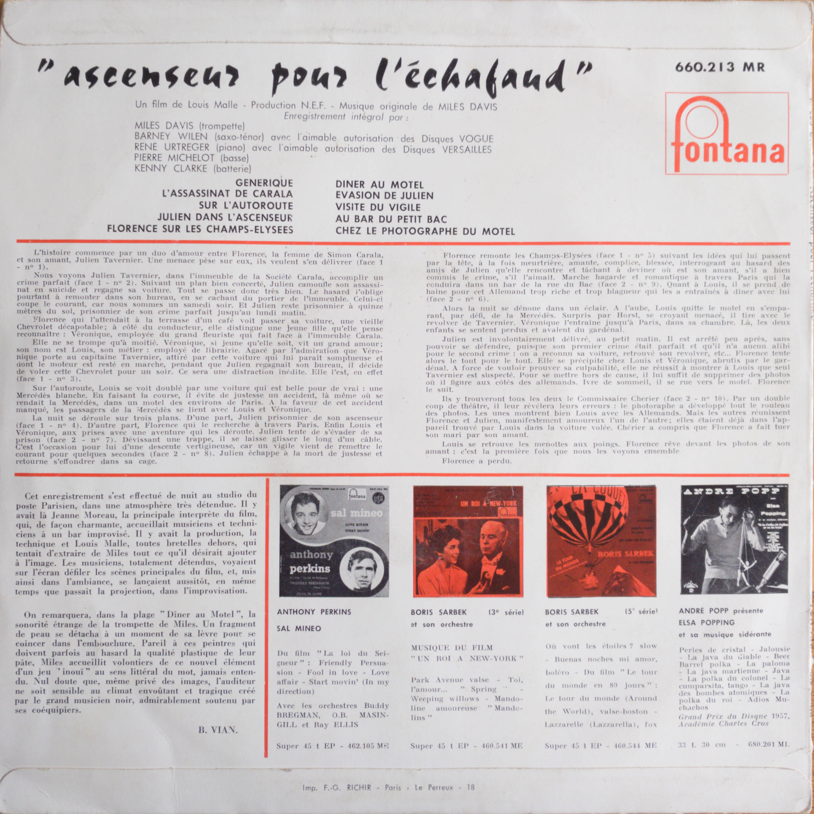 There is one tiny detail that makes this aspect of original copies of Ascenseur Pour L’échafaud much more complicated yet provides a powerful forensic tool. There are a variety of different numbers after the printer’s credit that can be used to identify when the cover was printed and thus accurately determine the age of individual copies. This number always comprises two or three digits. The first one or two digits identify the month and the last digit identifies the year. So, for example 18 represents the first month of the eighth year (i.e. January 1958) and 99 represents the ninth month of the ninth year (i.e. September 1959). The earliest copies I’ve seen were printed in January 1958 but I suppose it is theoretically possible (but unlikely) that some were printed in December 1957 given that the recording sessions only took place early that month. I would be interested to know if anybody has a copy with the number 127 after the printer’s credit. My assumption is that the last possible number that could have been used is 129 (for December 1959) but it is possible that no copies were printed that month. Extrapolating further, I assume that copies without a number were printed after December 1959.