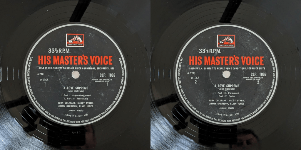 These are the labels from my EMI-HMV UK mono first pressing of A Love Supreme which was mastered from “safety” copies of the original master tapes. The fact that the mastering is different from Van Gelder’s is obvious from the much larger deadwax area.