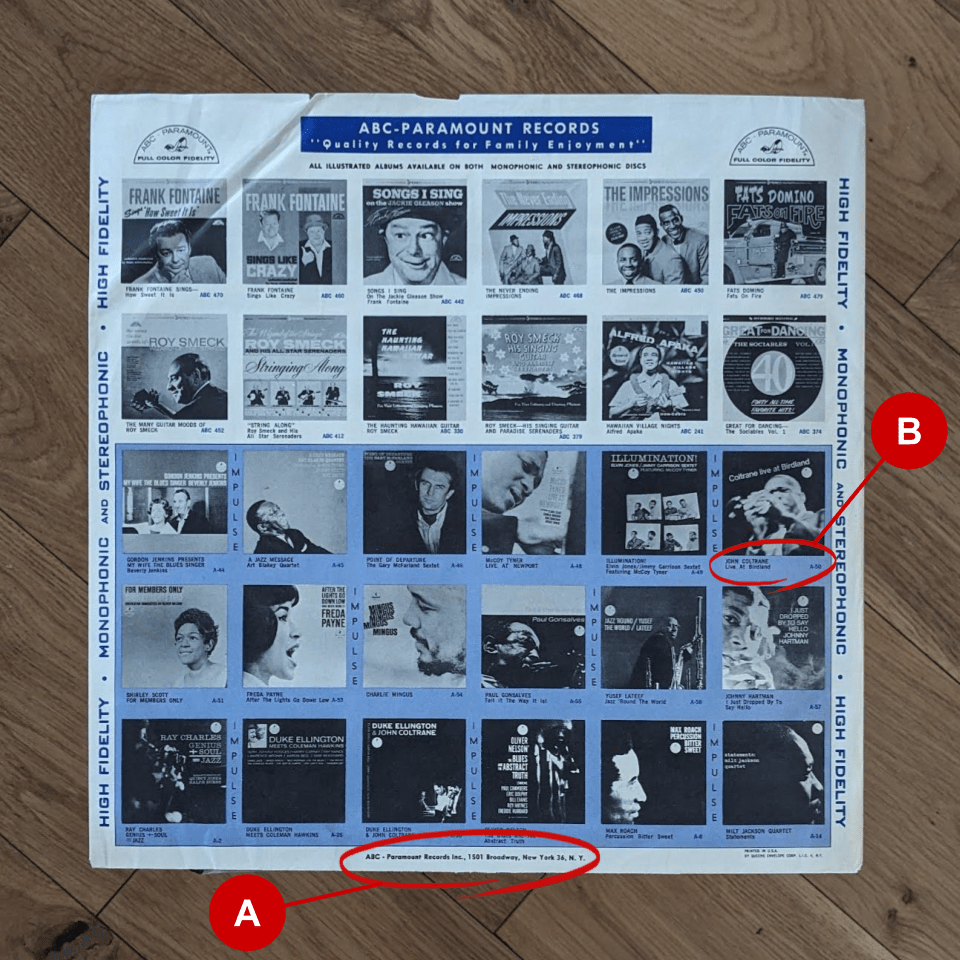 This is the inner sleeve that came with my Van Gelder mastered mono copy of A Love Supreme. It helps to narrow the window of the pressing date of my copy because this design of inner sleeve stopped being used around March/April 1966 after the Impulse office moved to 1330 Avenue of the Americas, New York, N.Y. Note the 1501 Broadway, New York 36, N. Y. address (A) and the promotion of A-50 as the highest Impulse catalogue number shown here (B).